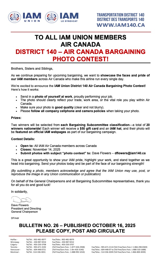 October 21, 2025 All IAM UNION MEMBERS AIR CANAD DISTRICT 140 – AIR CANADA BARGAINING PHOTO CONTEST! by Aaron Farrant Bulletin No. 026 – ENGLISHDownload Bulletin No. 026 – FRENCHDownload
