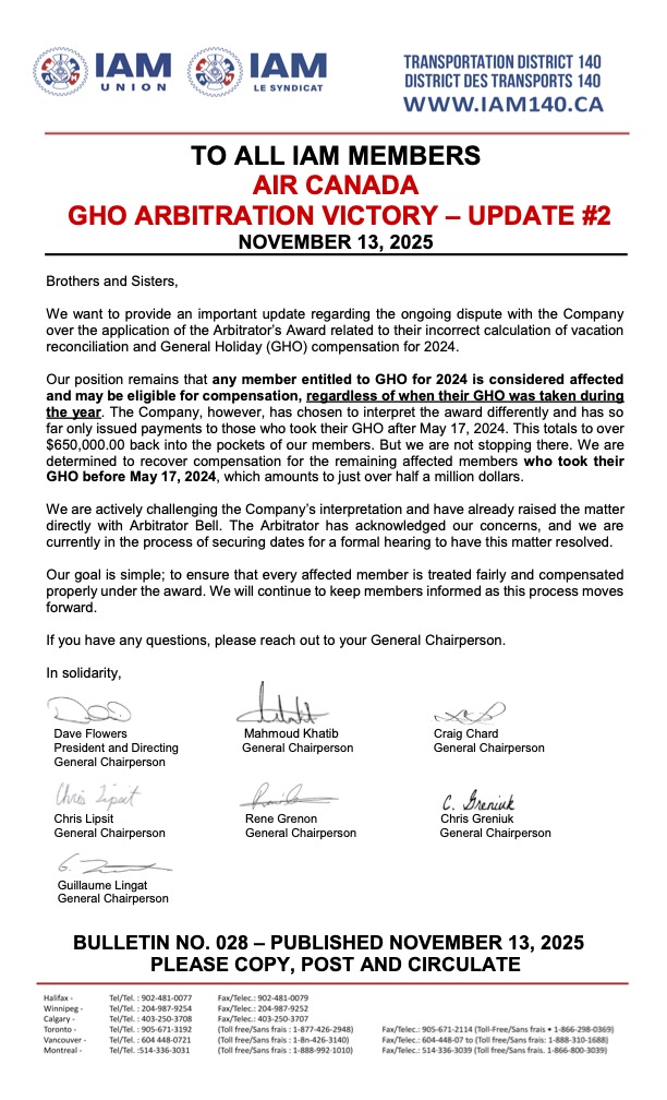November 23, 2025 ALL IAM MEMBERS AIR CANADA GHO ARBITRATIOIN VICTORY – UPDATE #2 by Aaron Farrant Bulletin No. 028 – ENGLISHDownload Bulletin No. 028 – FRENCHDownload